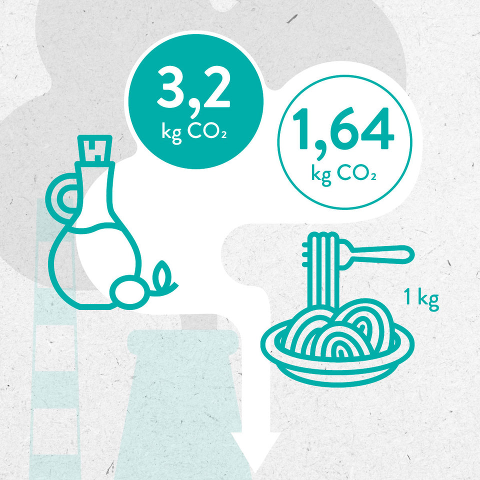 La produzione e la distribuzione di 1 litro di olio d’oliva producono in media 3,2 Kg di CO2e, mentre per 1 Kg di pasta (compresa la cottura) viene prodotto 1,64 Kg di CO2e.